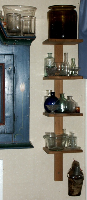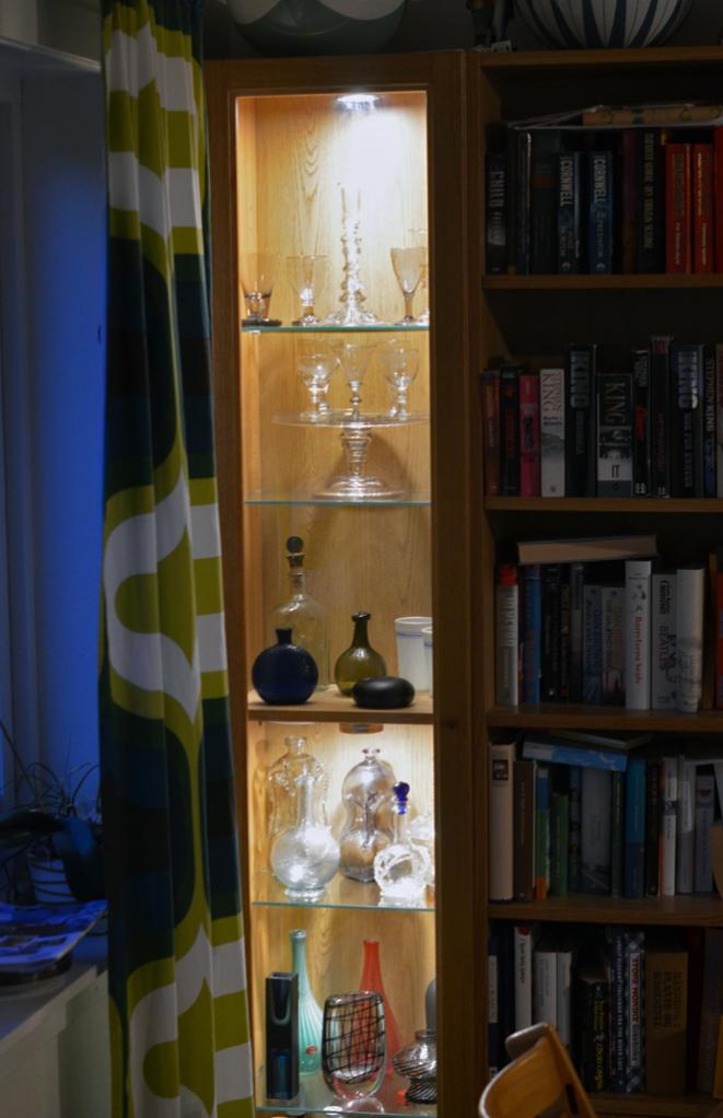 Tidigare hade jag BILLY i björk, men det gav glaset en färgton som inte var bra. Vita hyllor framhäver glaset bättre. Allra bäst skulle det nog vara med glashyllor, men då föremålen väger en hel del så känns det tryggare att ha dom på trähyllor.