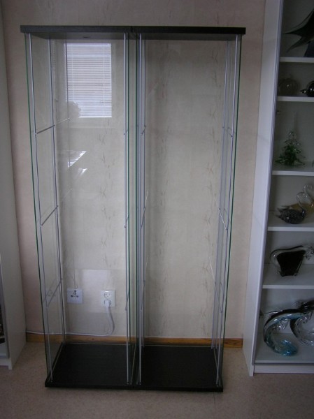 Idealet är om man har vita väggar som bakgrund eftersom man ser igenom glaset. Den enda plats/vägg jag hade för dessa vitriner var tyvärr den vägg där ett vägguttag samt tv-antennuttaget sitter, och det var ju inte så snyggt att se genom glaset. Vad göra? Jo, sätta papper på baksidan, så får det bilda en ljus bakgrund. Blev lite extrajobb men jag är nöjd med resultatet. Har således flyttat runt på hyllorna (igen!). Skickar med bilder hur det ser ut i DETOLF nu när föremålen är på plats.