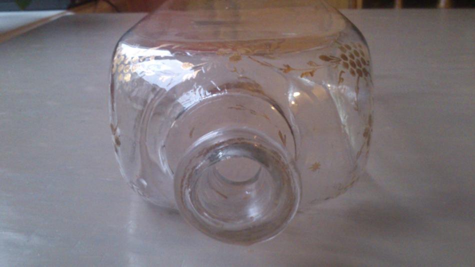 Jag köpte den nyligen på en antikvitetsaffär, han uppgav att det var 1700-tal. Den är förvånansvärt lätt, dekoren är i bronsfärg och målad för hand, motivet förefaller vara vinrankor. Nu tyckte jag mycket om den, därför köpte jag den. Men jag funderar på om det kanske inte är 1700-tal, utan en stilimitation från senare delen av 1800-talet, detta eftersom den rymmer 1 liter. Nu skulle det vara så att den är gjord för att rymma 3 kvarter. Vinrankorna skulle också kunna signalera att den använts för vin som dekanteras, eller möjligen något starkvin som madeira. Är det någon klokare person som bättre kan avgöra åldern?