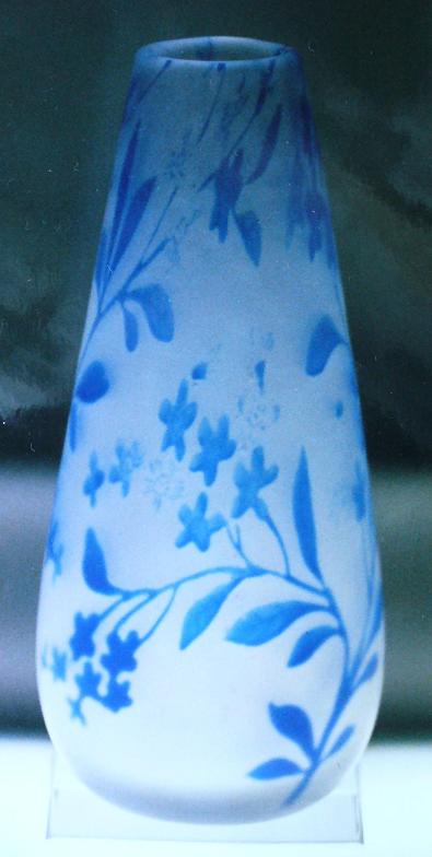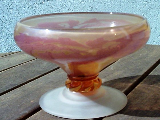 Trevligt att skålen väckte intresse! "Dammet" är nog mer dåligt ljus och fotograf. Precis som Rebello antar är foten syramatterad som de tidigaste graalarna, nyansen är mjukt päronsplitgrön. Sedan kommer den flätade knoppen i klarglas mellan fot och skål, och det är ju ett senare påfund. Själva skålen är inte syramatterad, men har ett relativt tjockt lager klarglas. Intressant är också blommönstrets konturlinjer och detaljer i avvikande färg (syns hjälpligt på bilden i första inlägget).