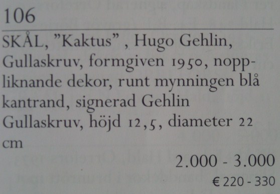 Jag har sökt lite på nätet och hittat lite info Hugo Gehlin men inte så mycket bilder på vad han gjort, annat än dricksglas. Det vore kul att veta mer om när vasen kan vara tillverkad, om det är Hugo Gehlin som ligger bakom den och om den har något värde.