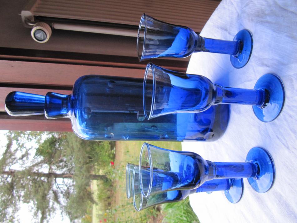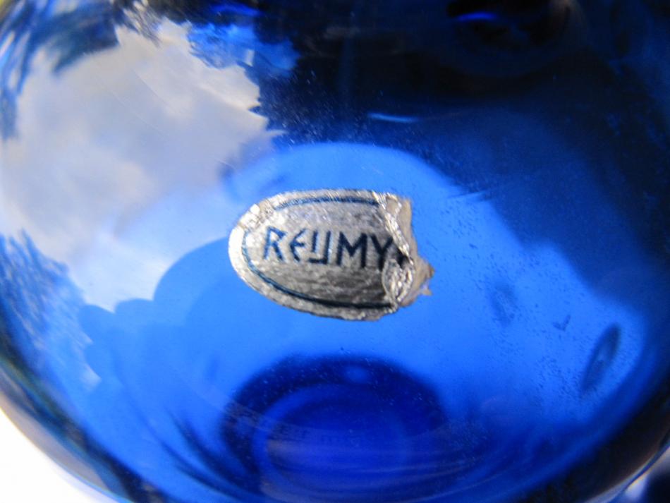 Denna vackra blå flaska med 5 snapsglas blev min efter besök på en auktion i helgen. Den är märkt Reijmyre (se bild) om glasen kommer från samma glasbruk vet jag inte då de saknar märkning.