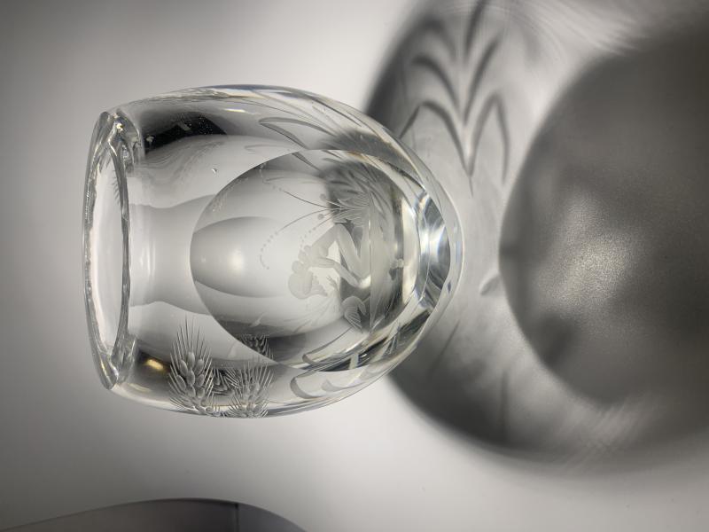 Det är en stor tung pjäs, något oval men nedslipad på ena sidan där dekoren sitter. (Slipad i lite art Deco stil).