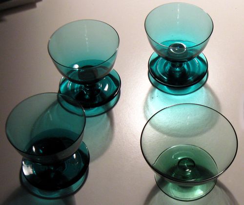 När jag såg coupeskålarna blev jag påmind om något mer jag har i ett skåp. Samma fina färg (4 st), förutom katten bland hermelinerna som är ensam och mycket grönare, men fortfarande åt det blågröna hållet. Tycker jag. Ibland. Blått och grönt är vi människor sällan överens om, tydligen inte ens inom oss själva!