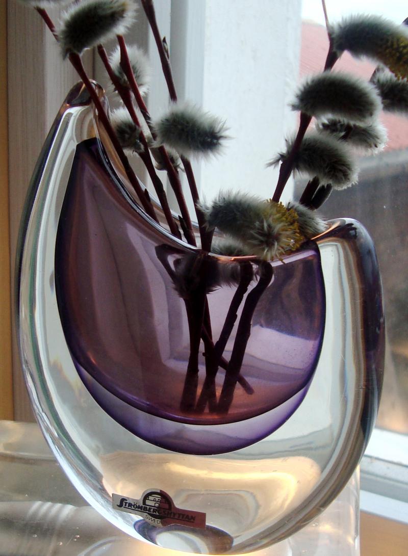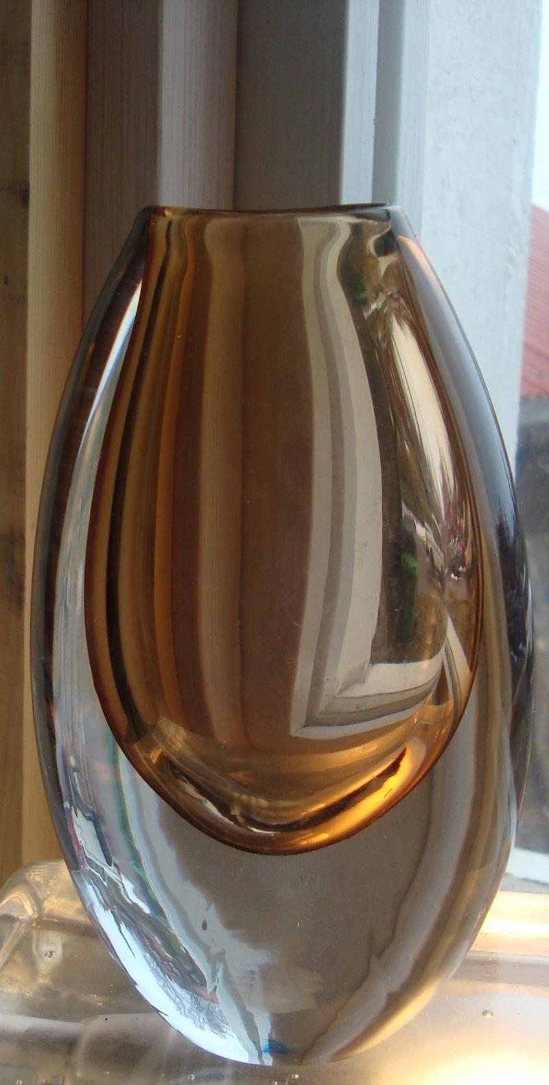 Det var simco som ledde oss till vasen på Freeforms och en sådan vas ligger fortfarande ute där: http://www.freeformsusa.com/glass/misc.htm. Man skriver: "Asymmetrical "sommerso"vase in brown and clear, c. 1950s. Engraved "B884 x75" , bears Strombergshyttan label. Height 7 1/4" (18 cm ) Width 5" (13 cm) $385."