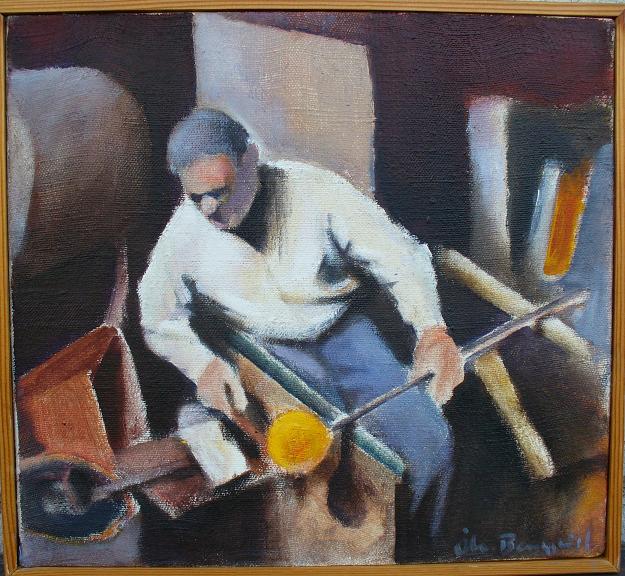Den här oljemålningen har som modell en av uppblåsarna på Bergdala glasbruk, och den målades av Åke Bergqvist vid mitten av 1980-talet.