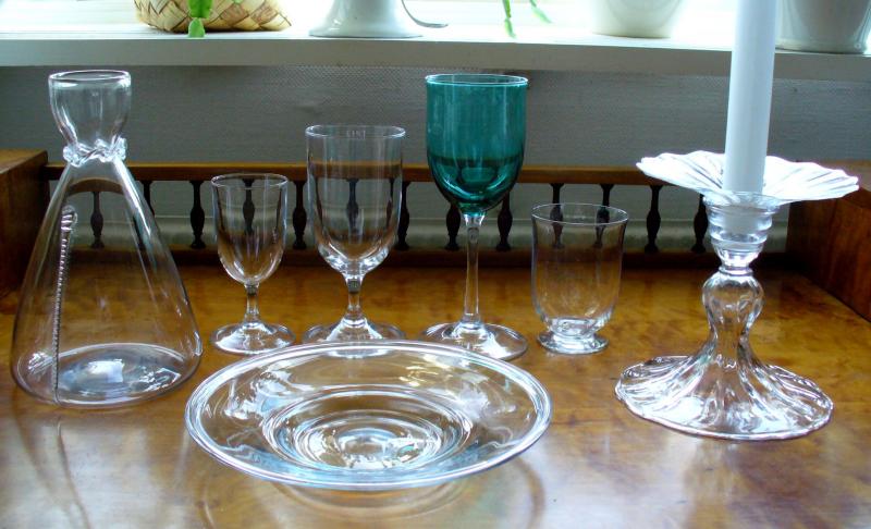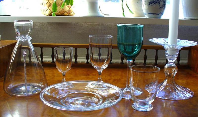 Från vänster i bild: Karaff E 131, glas ur servisen S 2 Haga (starkvin, rödvin, vitvin och selters) samt Ljusstake P 12 med manschett P 13. Assietten A 15 är med men tyvärr inte den tillhörande efterrättsskålen M 14 - som jag dock minns från Asta Strömbergs dukade festbord på Strömbergshyttan. Den visas här på en ritningsbild.