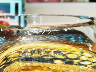 "Denna plunta är av Lindefors första kristallglassmälta sedan bruket återupbyggdes den 1/11 1929. Tillverkad av Knut Bergquist."