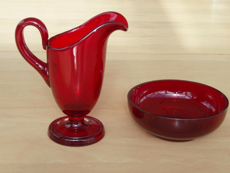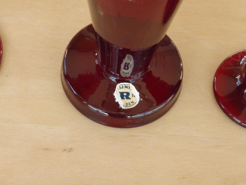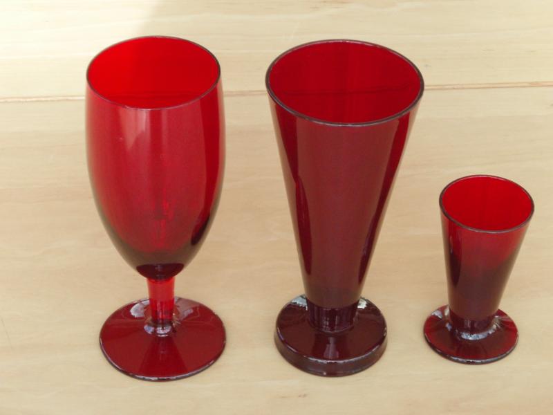 Jag har köpt lite rött glas på auktion. Jag antar att detta är Monika Bratt som designat dessa glas. Vinglaset h=15,5 cm, snapsglaset h=8 cm och ölglaset(?) h=15 cm, kannan h=14 cm och sockerskålen h=4,5 cm diam=11,5cm