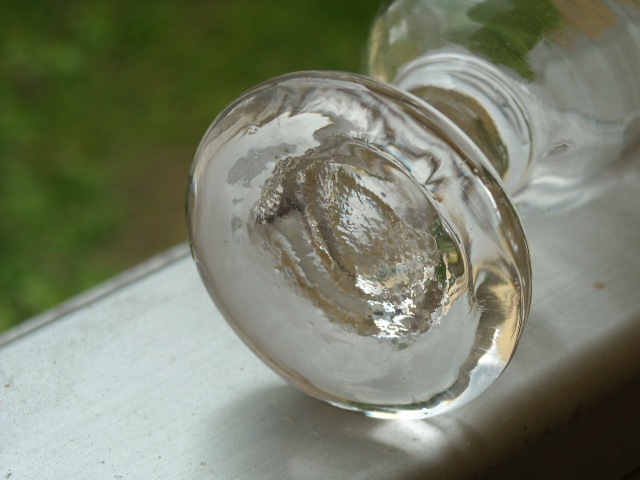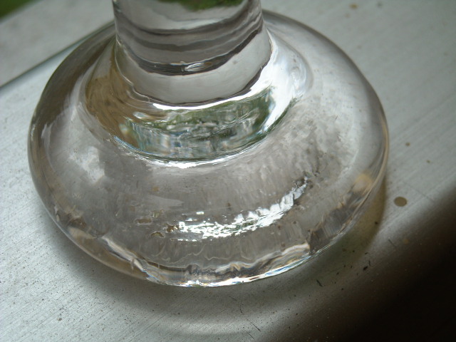 Grattis till en ovanlig klump vill jag säga, bra slitage talar ju ålder, ser du om det är ett pålägg glas på foten, det ser ut som en glaskant på foten, kupa och ben ser ju friblåst ut, och sedan ser det ut som dom tagit upp glas på benknoppen och stöpt i en form till fot, kanske stöpt i en lerform, ett mycket märkligt förfarande att få till detta glas,