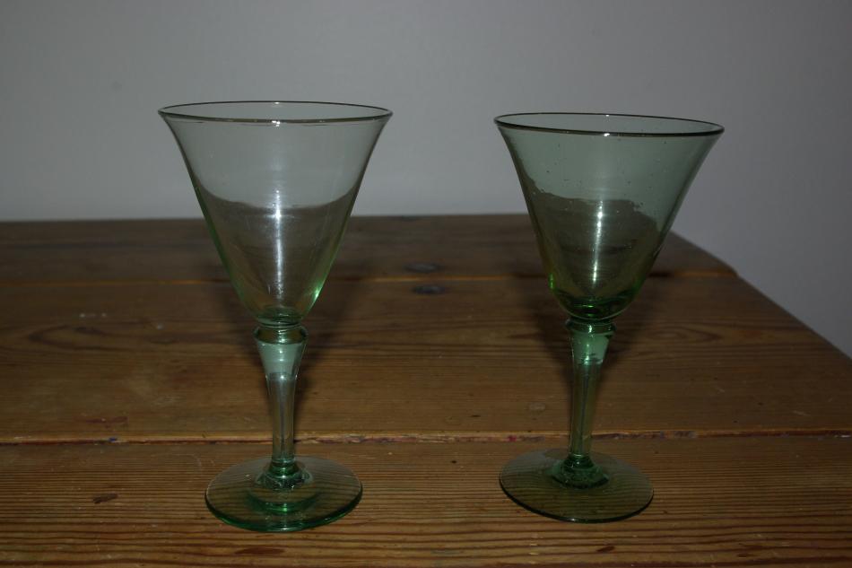 Ärvde ett dussin vitvinsglas i svagt grön ton, 15 cm höga. Som framgår av bilden är de inte helt "perfekta" utan man kan se lite småbubblor och även "linjer" i glasen.
