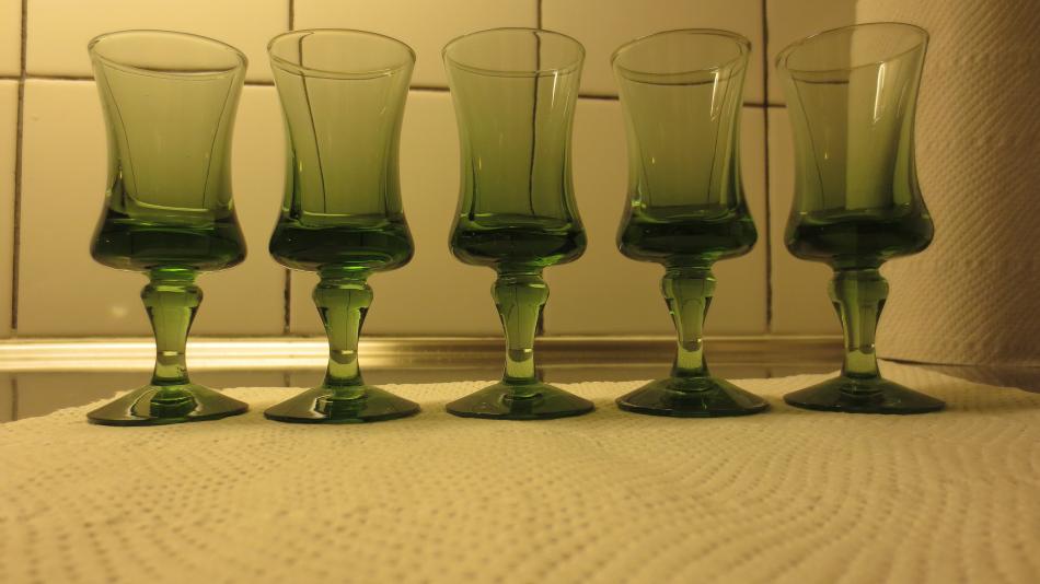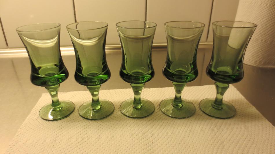 Gröna mindre glas samt bruna mindre glas. Ej Skruf?