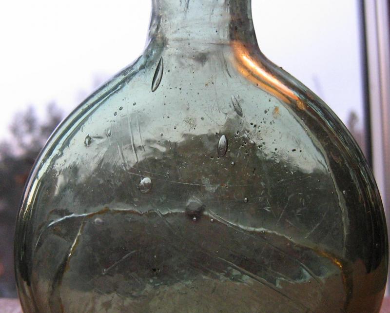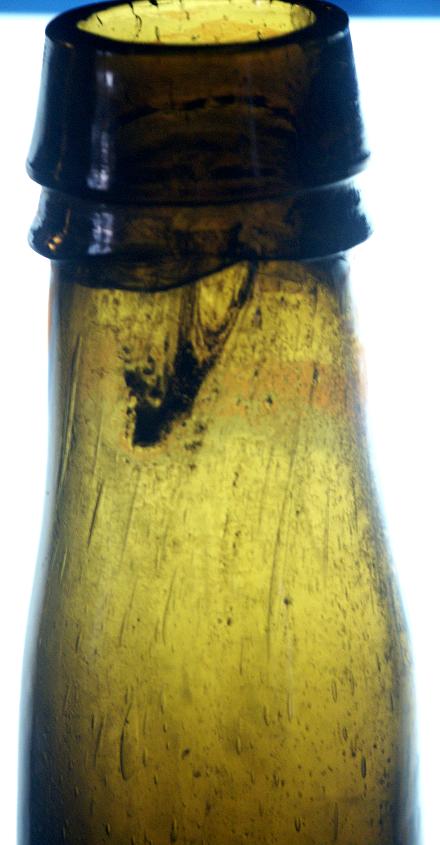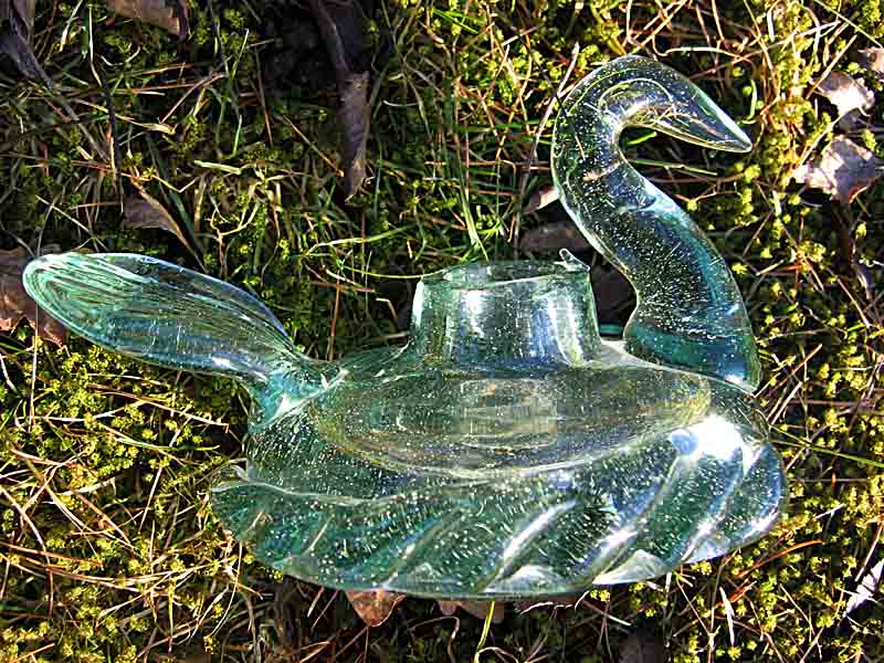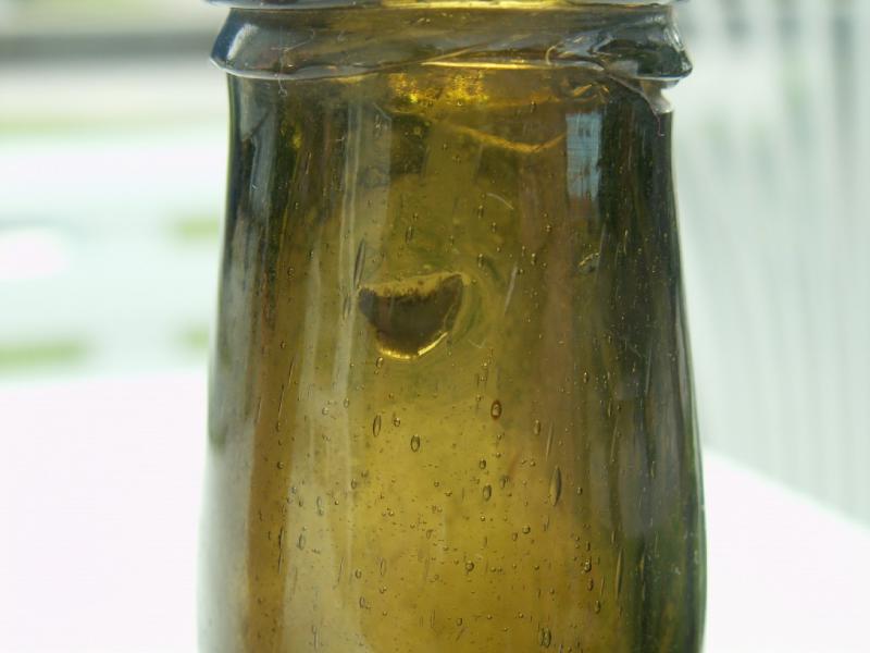 Jag börjar med en svårfotad sak, det är en (STEN) som är på väg att lösas upp i den varma glasmassan, den går i grönt på glaset, inte mörk som bilden visar, 3cm lång är den, svulstig på båda sidor av glaset, (sticker ut) som en böld, liknar en rejäl snorkråka