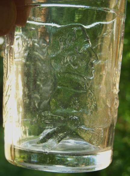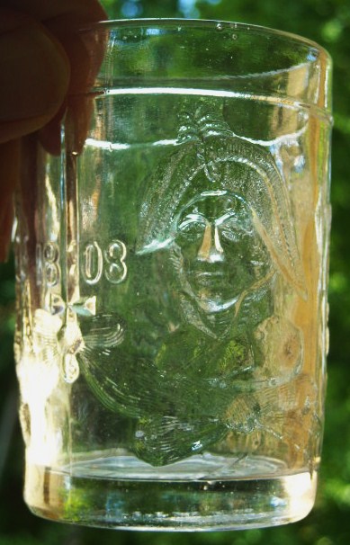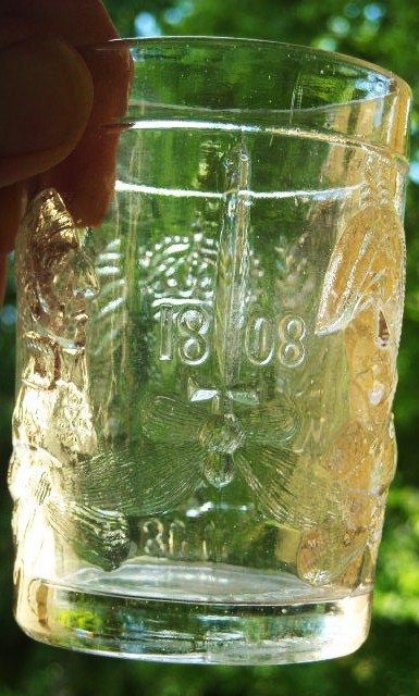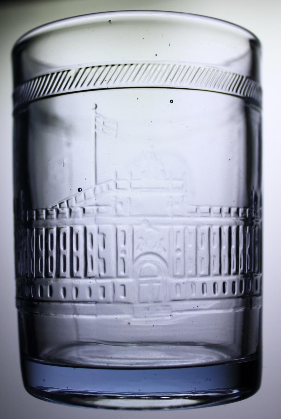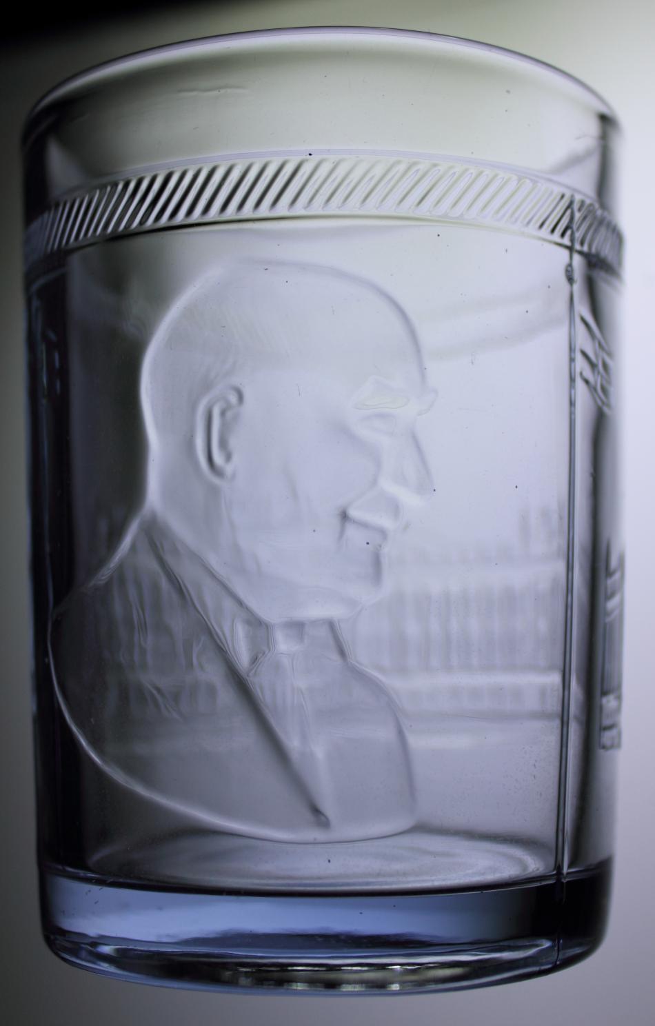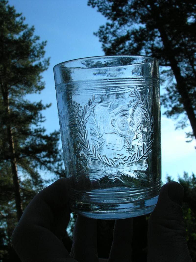Lägger in några bilder på ett liknande glas med Per-Albin och riksdagshuset i Stockholm. Jag tror det är tillverkat med anledning av riksdagens 500-årsjubileum 1935. Någon som vet vilket glasbruks som tillverkade glaset och om det finns i färgat glas också?
