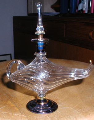 En sån liten charmig aladinlampa i form av en parfymglakong. Glaset är mkt tunt. Tänkte genast på Italien och tiden 50-tal? kan ngn verifiera eller säga emot?