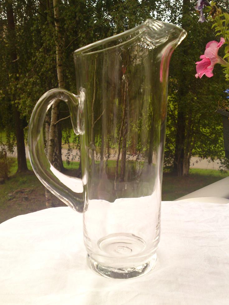 Vilket glasbruk har gjort denna kanna? Höjd 26 cm med liten tung fot samt oslipad puntel.