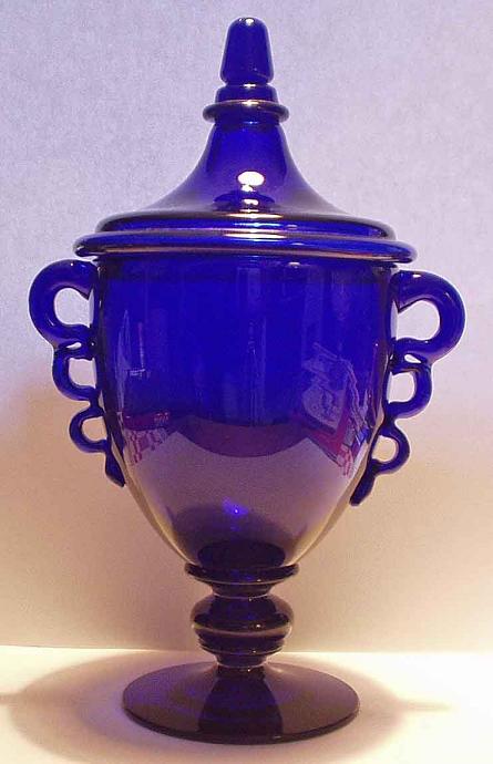 Den vackra blå är 22 cm. hög, med locket. Jag har för mig att den är formgiven av William Stenberg, Gullaskruf?, och att det är en sockerskål?