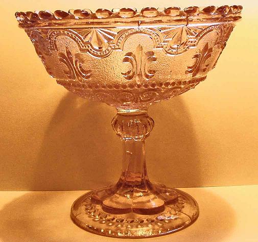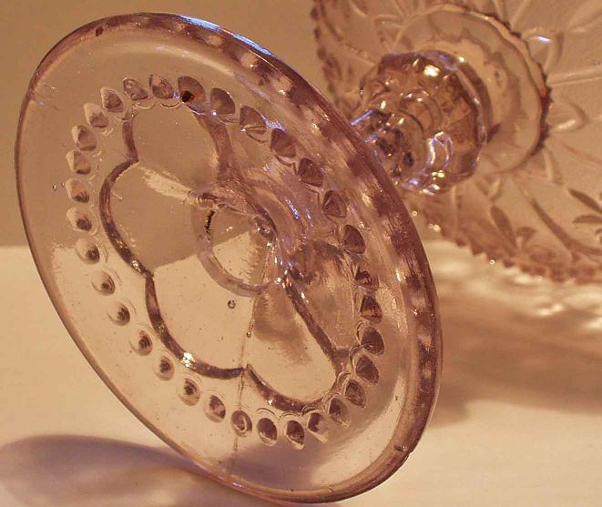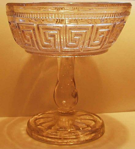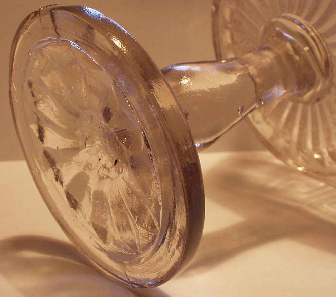 De båda pressglasskålarna är ca. 13 cm höga, båda har puntelmärke. Den med "taggiga" kanten är lilatonad i massan. På den med meanderbården syns det tydligt hur benet och skålen satts ihop efter formblåsningen.