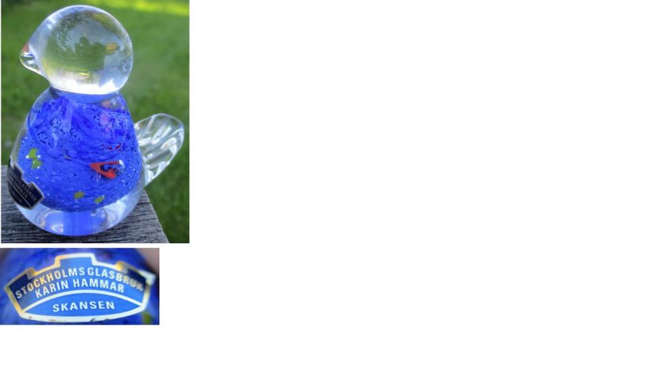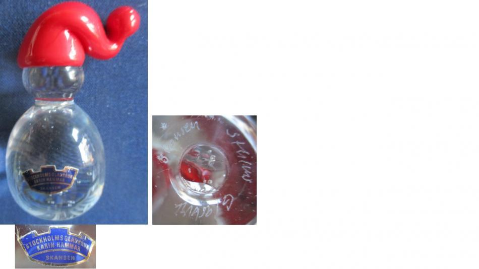 Den blå etiketten (jfr #85 med svart etikett) anger att det är när Karin Hammar drev glasbruket. Gravyr finns på den minimala ytan undertill: "Sthlms Glasbruk Skansen". 8 cm hög och undras om det gjordes fler "julfigurer"?