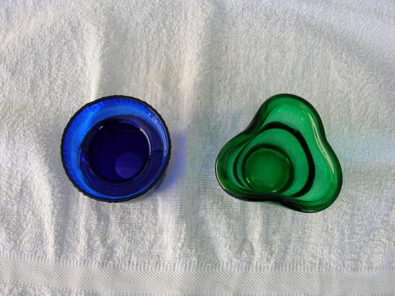 Den gröna känns 30-tal, kan det vara Gullaskruf? Sen undrar jag hur länge värmeljus har funnits, fanns det på 30-talet t.ex?!