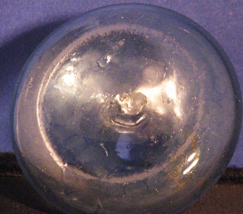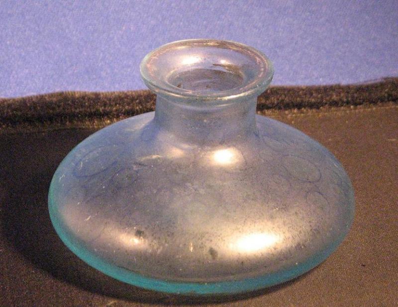 Ca 6 cm bottendiameter. Frostat glas (utom undertill) med iriserande yte. Handdrivet glas, rejält bottenslitage, brutet puntelmärke. Är min känsla rörande bläckbehållare riktigt, har svårt att se vad man annars använt det lilla kärlet till.