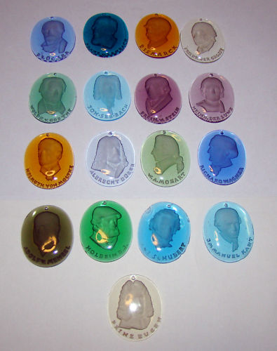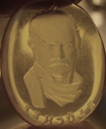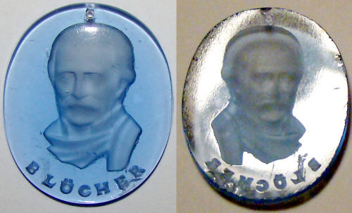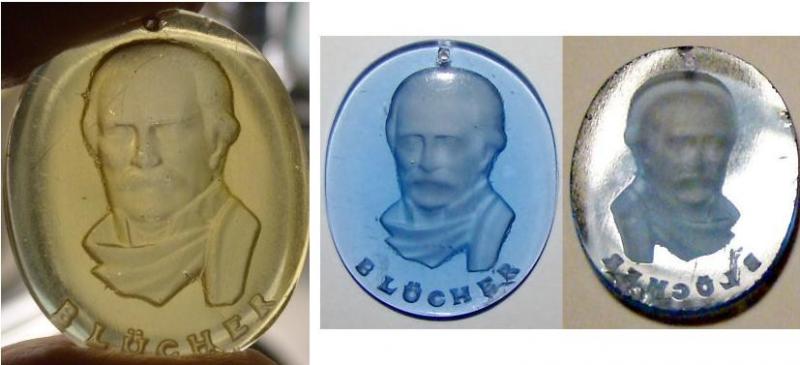 .Glas, planslipad baksida, djupgravyr. Gammal ? Föreställer antagligen Gebhard Leberecht Blucher, generalfältmarskalk som bidrog till att de allierade segrade vid Waterloo. Litet upphängningshål upptill