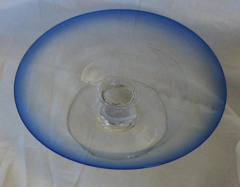 Jag stod ganska länge och höll i det här fatet. ( diam på serveringsytan 20 cm) och kunde inte riktigt bestämma mig för vad det var. Väldigt skitigt i butiken, såg lite blåsor, den drivna ytan och ett rejält slitage på den snålt tilltagna anbringningsytan på foten. Avgörandet fälldes av den lätta vikten och det lättviktiga priset. Fint brutet puntelmärke med sot el. metall i " såret". Drivet glaset är inte riktigt mitt kunskapsområde, har ju snöat in på pressglas. Kan ngn utifrån mina bilder lotsa mig rätt i fråga om tid och ålder? Fatet känns både rätt och lite lurigt.