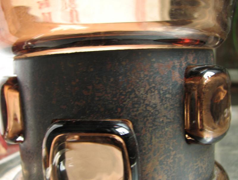 Vasen är tung, 12.5 cm hög, kulslipad botten, en lustig bred " gördel " runt om, verkar nästan klistrad, eller...vet inte riktigt.