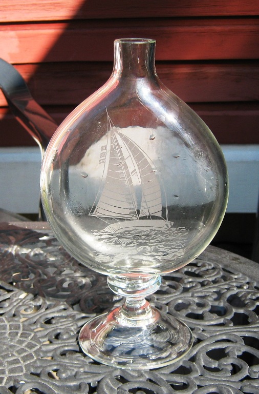 Roligt när gör dig till tolk för så många, tack för det. Trevlig karaff. Skepp är det inte utan en ganska modern fritidsbåt med merconirigg (bermudarigg) som kom först i början av 1900-talet.