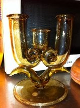 Jag undrar om någon vet vem som designat denna ljusstake och för vilket glasbruk i så fall? Jag är inte ens säker på att det rör sig om en ljusstake. Snarare lutar jag åt att det är en variant på vas. Höjden är 16 cm och foten är nästan lika stor i diameter.