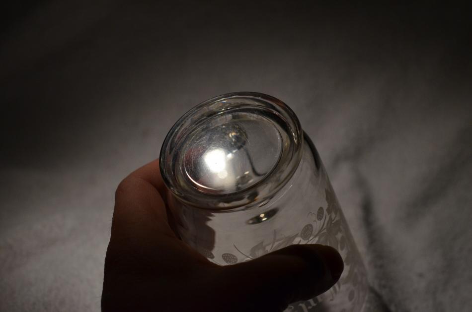 Nu har jag kollat priskuranter för Kosta 1896, Reijmyre 1899 och Fåglavik 1900, men har inte hittat sejdeltypen. Kanske måste vi flytta fram i tiden till 1930-talet eller senare, då dryckesglasens kupor åtminstone i serviserna hade en mattslipat kantrand, dock mera sällan två som på sejdeln. Slitaget ser ju ganska milt ut.