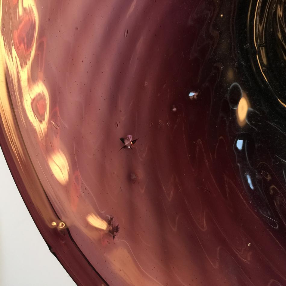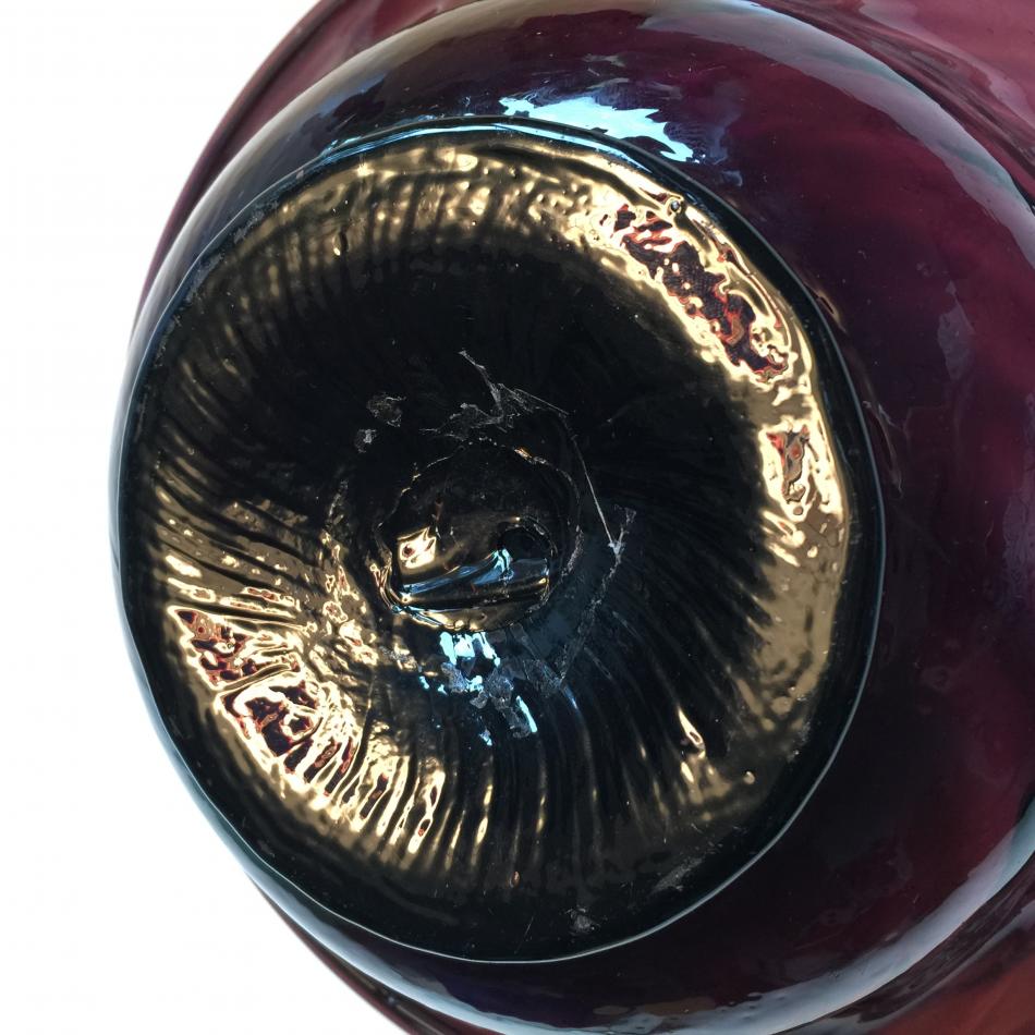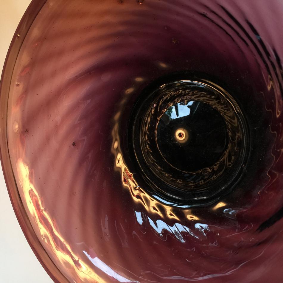 Ny här på forumet! Och börjar med ett litet inlägg om en violett glasskål jag köpte idag. Den har omvikt kant, och glasmassan är full med lusor och osmält sten- o grusmaterial. Undersidan är ojämn, men är inte så värst nött. Puntelmärket är inte så vasst, (på bilden syns rester av ett stöldmärke från Stadsmissionen). Bottenplattan (om man kan kalla den så) är ganska tjock. Jag hoppas att bilderna är så pass bra att alla glaskunniga kan avgöra åldern.