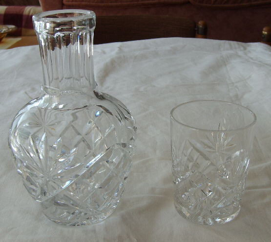 Nu har vi i alla fall en vattenkaraff med lite stil. Har inte velat betala 3-400 för en formblåst med glas. Så det fick bli en slipad dito i stället.