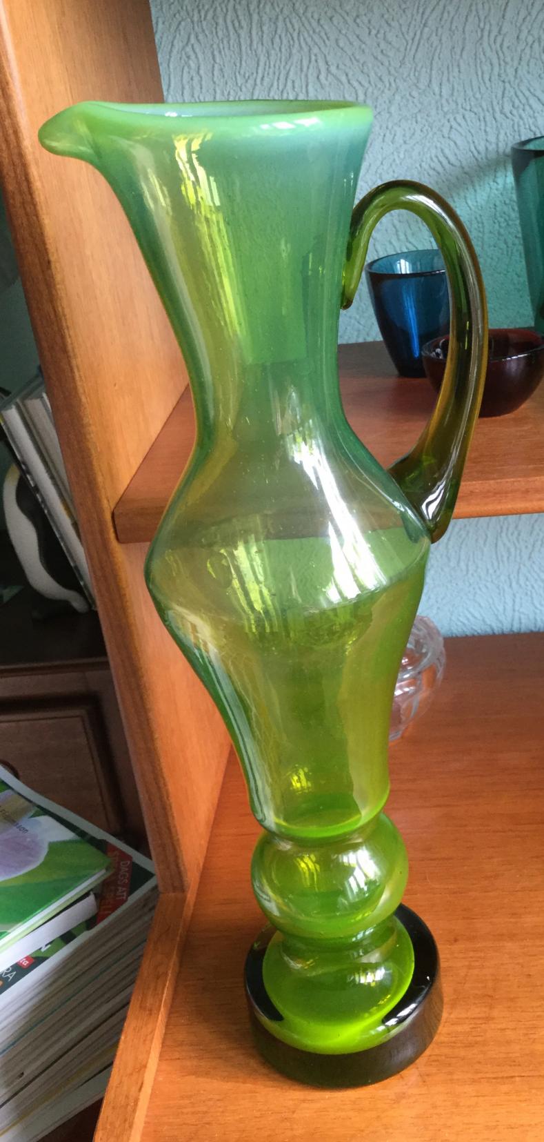 Köpte denna på loppis igår. Den är 39 cm hög, har blåsor i glaset. Är kulslipad i botten och av slitaget i botten ser jag att den har varit med ett tag. Ingen signatur. Undrar om någon har en aning om formgivare eller glasbruk?