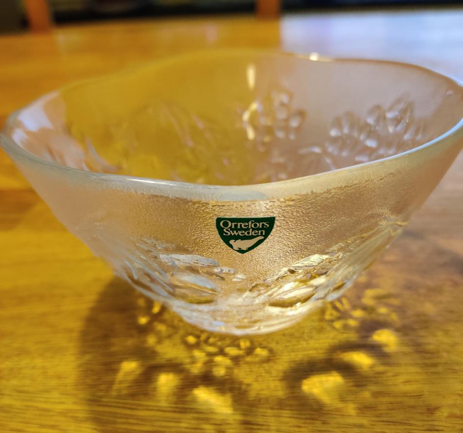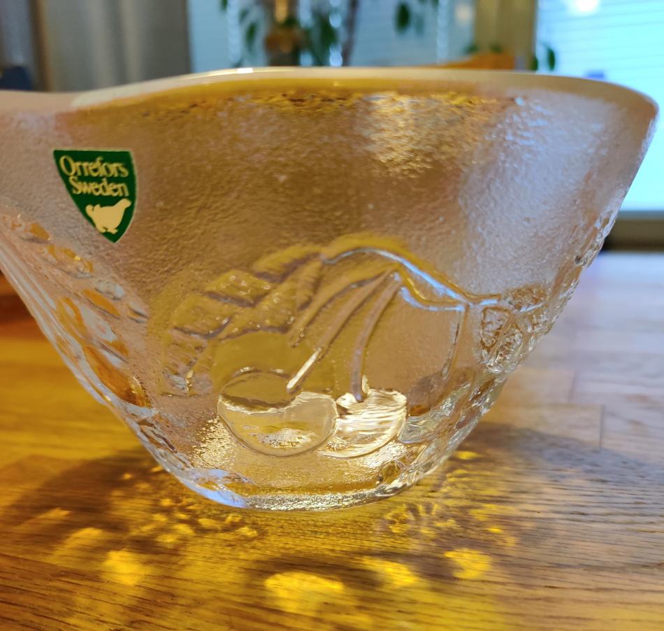 Hej! Jag och sambon har hittat en skål i skåpen här, med ett mönster jag inte känner igen. Jag har letat och letat på nätet men hittar inte vad den heter? Den är ca 7 cm hög och 14 cm bred upptill. Jag tycker den påminner lite om serien "Grape", men det är väl Kosta Boda? Den har ett mönster med körsbär runtom i varje fall.