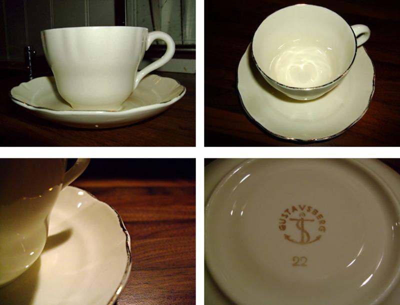Det är beiga koppar med guldkant, samt vågor (?) i porslinet.