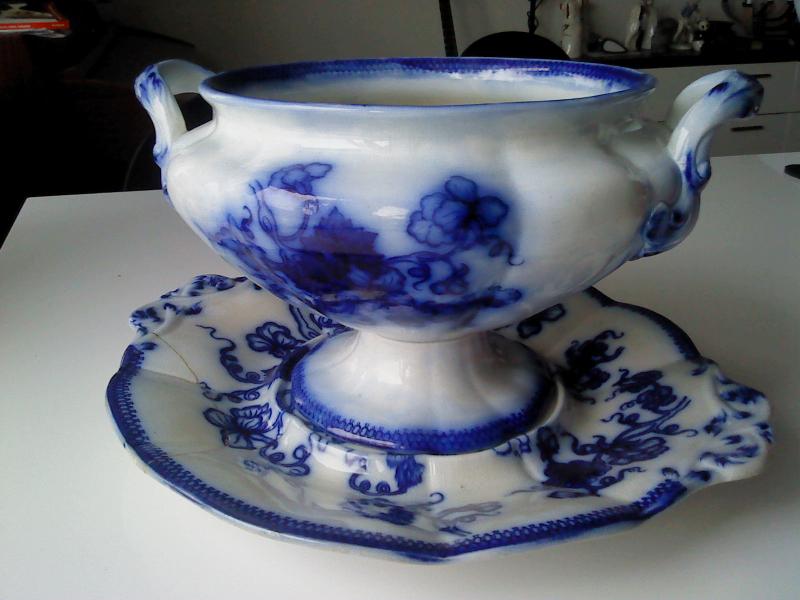 Hoppas någon kan upplysa mig lite mer om den här fantastiska, vadå? Jag antar att det skall vara till soppa men är inte säker. Fatet är säkert 30-35cm i diameter och den mäter nog gott och väl 20-25cm på höjden.Stämpeln är Gustafsberg med F och jag tror att det är stämpeln från 1839-1860. Tyvärr kunde jag endast plåta med min mobiltelefon så resultatet är denna gång inte lysande. Tyvärr är den trasig och lagad men jag misstänkte att dessa inte växer på träd och valde därför att slå till ändå. Hantverket är ju fantastiskt.