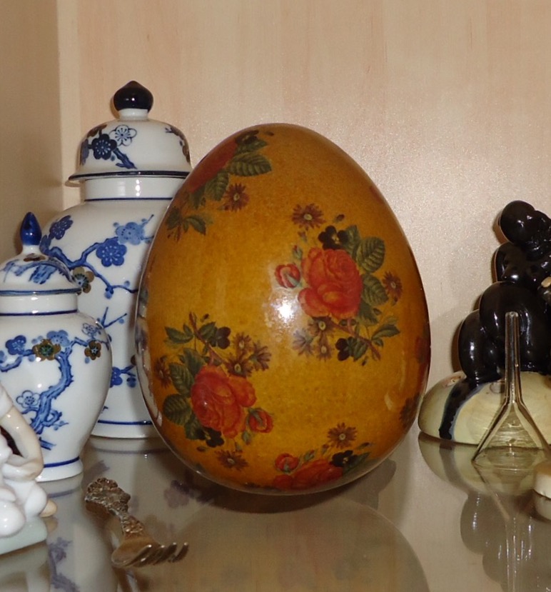Har en fin Äggskulptur av Lisa Larsson Ägget tillverkades i Lisa Larssons ateljé i Gustavsberg i mycket liten upplaga, under senare hälften av 70-talet. Materialet är Stengods, högbränd lera och mönstret är Chromo-tryck, en slags tryckt dekor som överförs och sedan glaseras. Ägget är i perfekt skick och etiketten finns kvar undertill. Måttet är 16,5 x 11 cm. Har sett lite mindre ägg som gått på auktion för mellan 2400-6500 kronor. Kom över det här ägget av en ren slump när jag besökte en Second Hand-butik och jag fick betala 300 ! kronor :-) för det.