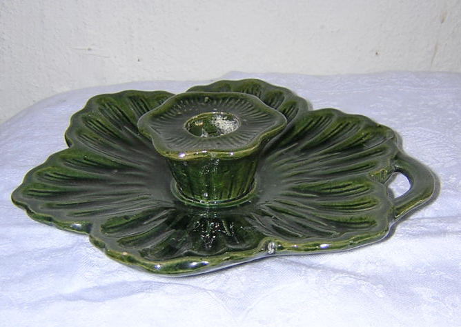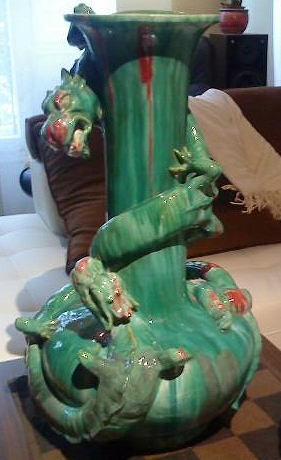 Det här är en vas, flankerad av doppingar i form av hänklar. Allt verkar stämma för en Höganästillverkning, till och med den gula skärven, vilken syns i botten. Det är bara det att inga synliga stämplar finns. Kanske döljer den sig under tjock glasyr runt fotringen? Jämför gärna med undersidan på det omärkta ödlefatet i inlägg 6.