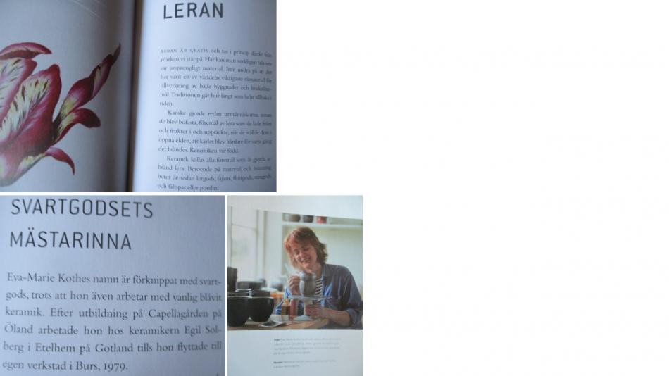 Uuve Snidare och med foto av Nisse Peterson av förlag Forum (2005) finns i boken om slöjdkonst bland mycket annat ett kapitel om leran och svartgodsets mästarinna, nämligen Eva-Marie Kothe (f.1954). Efter arbete hos Egil Solberg i Etelhem flyttade hon till egen verkstad i Burs, Stånga på Gotland. Terra sigilata finns också i bild och text. Mer om Eva-Marie Kothe-Sjöholm här https://www.blasknada.com/ovre-rummet-ljud-av-karl/