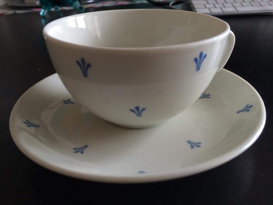 Halloj! Har inget namn åt dig men det ser ut som om godset är ganska kraftigt och inte så där benporslin-igt tunnt som många kaffekoppar från slutet av 40-talet. Därav kan man misstänka att denna kopp ingick i en restaurangservis och vad jag förstår var de sällan namngivna. Någon mer kunnig person får kanske rätta mig här