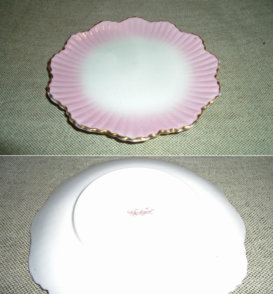 Gamla Rörstrand assietter (jag har 6) som inte har något namn eller nummer på undersidan, bara loggan. Som synes på bilden är de vita i botten men rosa utåt kanterna samt har guldkant.