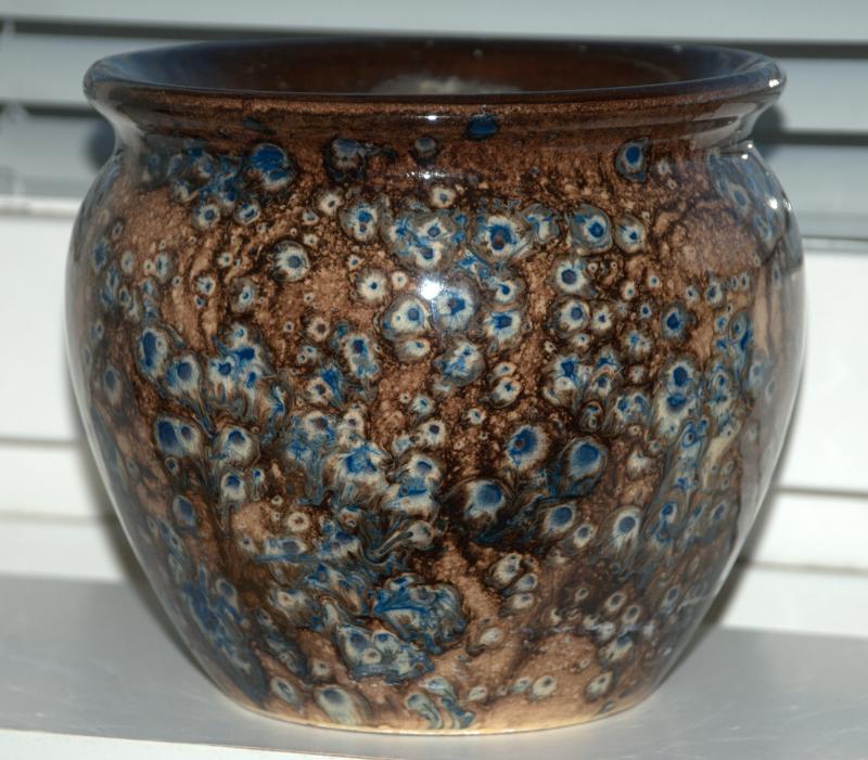 Det kanske var meningen att efterlikna millefiori i brevpressar av glas? Det är mera dropp- än rinnglasyr på krukan och resultatet blev ju snyggt.