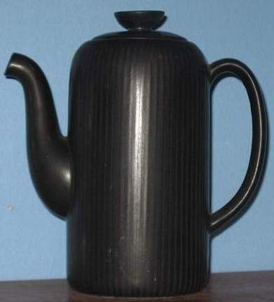 Aha, nu ser jag! Det är corona-modell på tallrikarna. Och tekannan har jag sett förut, i en ljust turkosblå glasyr. Sockerskålen är lågt cylindrisk (som en trumma) och inte så ovanlig. Men att hitta den med mangania-glasyr blir svårare. Nej, jag tror inte det finns några koppar. Jag tror att man använde samma koppar som till AR.
