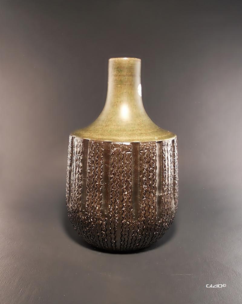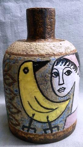 Trots att keramik inte är min grej, så kan jag väl få prova, det lilla jag läst o snappat upp, om fatet o vasen hör ihop har jag ingen aning om , men vasen, där känner jag (och kanske du) igen UE Uppsala-Ekeby o den lilla lustiga krumelursignaturen, så brukar ofta Marie Simonsson signera sina verk, sedan serie o när den gjordes osv, kommer du få svar av kunnigare människor av.