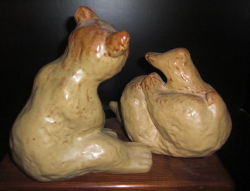 Hej. Har en liten fundering ang dessa två björnar, Ligger/sitter på samma skiva kan detta vara en Vicke lindstrand skapelse ? Ej sign under. Eller någon som har någon ide på vem det kan vara.