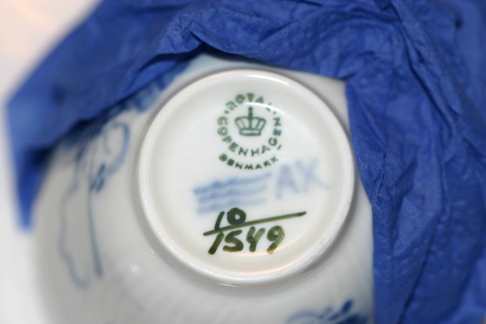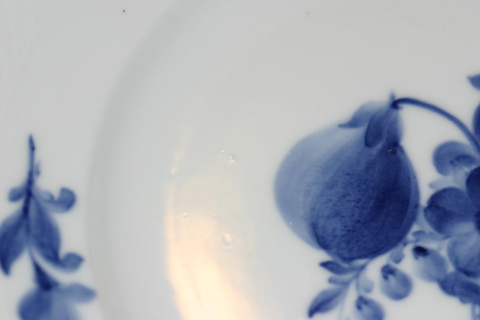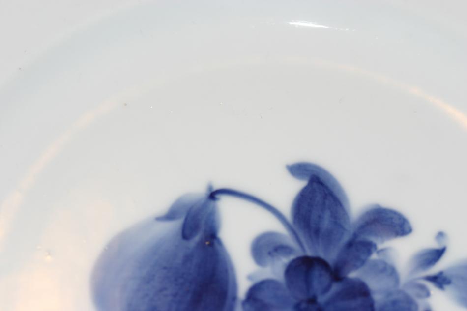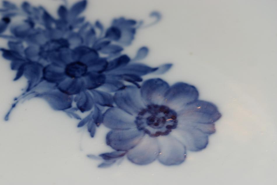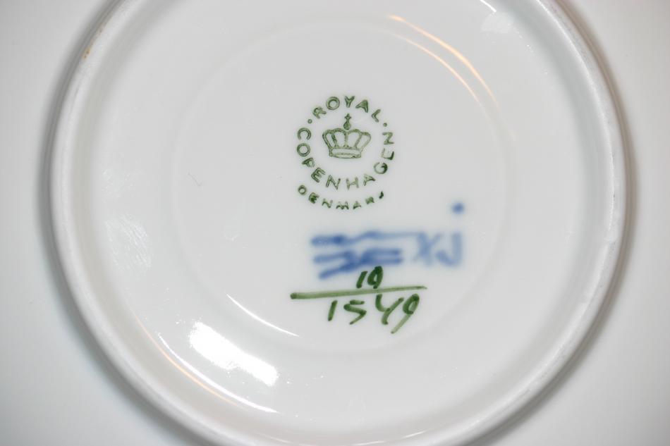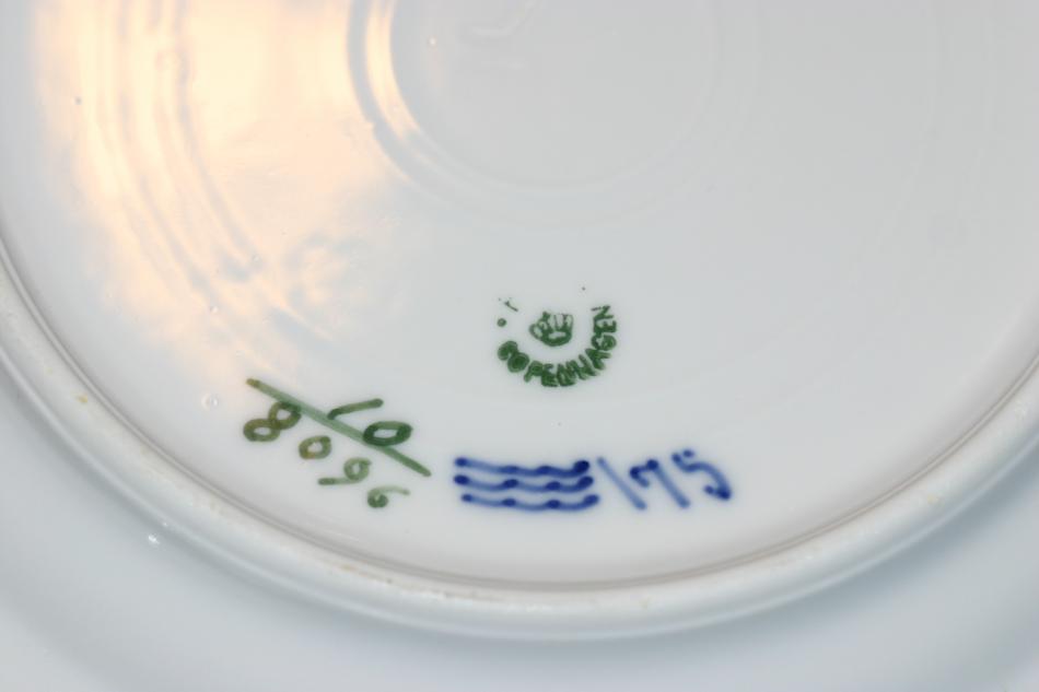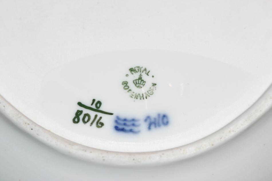 Matservisen är äldre. Om jag förstått det där med stämplarna rätt så är den från före 1922 (stämpeln ser ut som dagens stämplar, men det står inte Denmark under). Glasyren på delarna till matservisen är inte lika jämn och slät som på den modernare kaffeservisen. På matservisen förekommer små ojämnheter och bubblor. Är det alltid så på äldre porslin från Royal Copenhagen eller är det något problem/fel som man skall ta hänsyn till om man t ex skall sälja servisen?