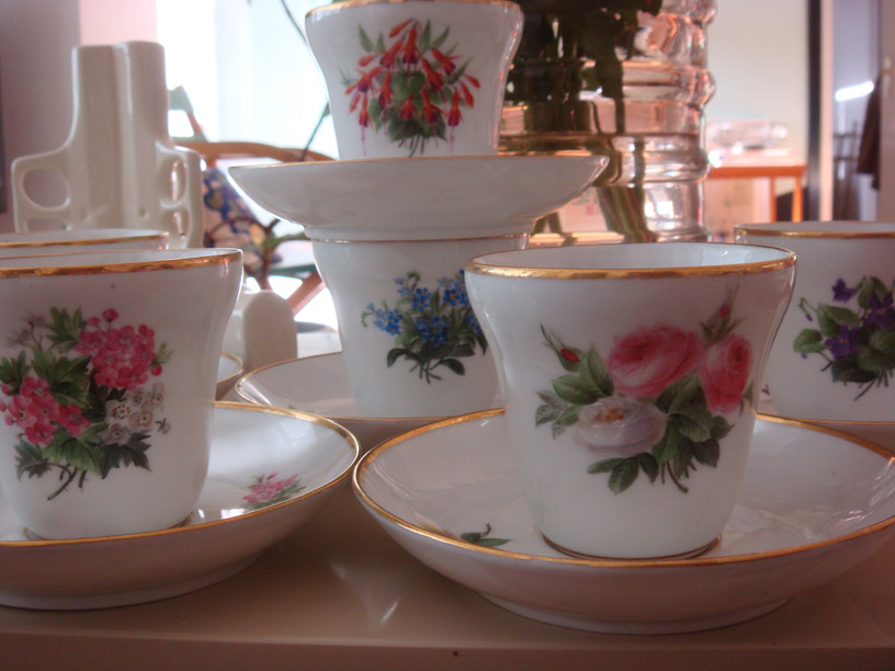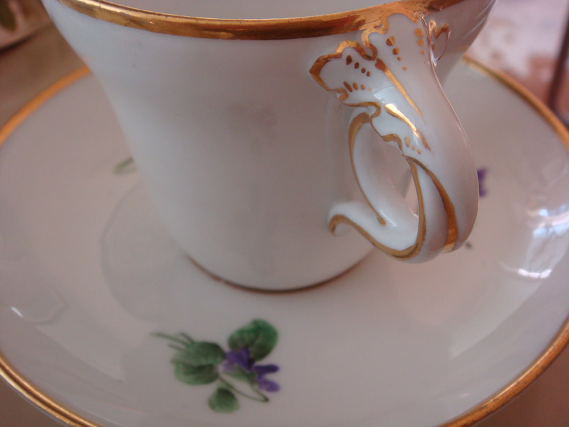 Jag har förstått att den här märkningen användes innan 1900 men undrar nu om någon har något knep att bli mer precis än så? En av kopparna är märkt med ett Z utöver vågorna och alla delar har ett ensamt nummer (ett fat BX) ristat i glasyren. De är ganska stora: koppen c:a 7.5 cm hög och c:a 8 cm vid, så jag förmodar att det rör sig om tekoppar?