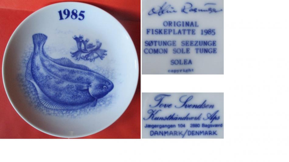 I slutet av 1900-talet måste man ha haft en uppfattning att väggarna i alla hem skulle prydas med blå tallrikar i porslin! En av producenterna var Tove Svendsen Kunsthandværk Aps i Bagsværd (förort till Köpenhamn). Från 1985 kommer här en sjötunga (Solea Solea) på en fiskeplatte. Det var länge sedan (eller aldrig) man åt en Sjötunga Walewska med pommes duchesse och garnerad med skivor av hummer och tryffel.....