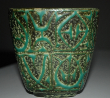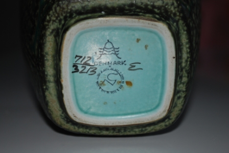 Flerfärgad konstfajans kallas materialet för och formgivaren i det här fallet, kan vara Harald Georg Slott-Möller (1864-1937), och han var anställd hos Aluminia 1902-06.